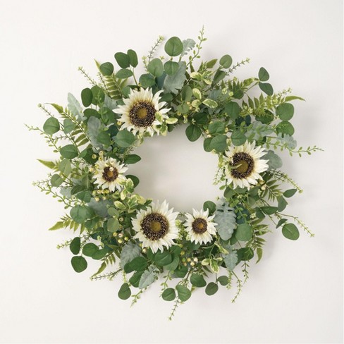 Simple and elegant, our mini eucalyptus wreath freshens up interiors with a light touch. Everyone will love how festive your home feels with this wreath. Here are the easy steps i followed to make this wreath and the things you will need to do it! Unlit green artificial wreath with golden orange sunflowers white cream sunflower, lush greenery, twig, white cream sunflower, lush greenery, twig, decorated on the grapevine base, incorporating the bright color and blooming flower.it can bring you a fresh and innovative feeling for every season.artificial golden orange sunflowers, green silk leaves are securely attached to a grapevine. Rated 4 out of 5 stars.